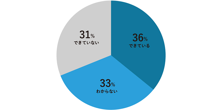 「できていない(36%)」「わからない(33%)」「できている(31%)」がほぼ互角に。Q1の質問で「キッチンの衛生管理レベル」を4以下(低評価)とした方の多くは「できていない」を選択。5~6(中評価)とした方は「できていない」「わからない」がほぼ同數でしたが、中でも「5」を選んだ方は「わからない」を選ぶ傾向が見られました。