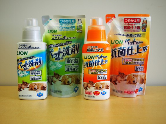 ここで、おすすめのペット用洗剤をご紹介しましょう。ペット特有の汚れを研究してつくられた「ペット用品の洗剤」「ペット用品の抗菌仕上剤」(共にLION製)です。