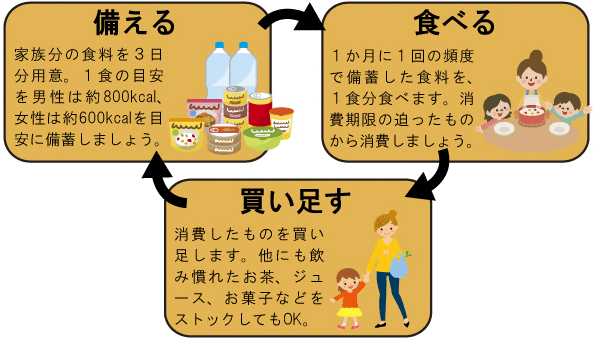 家族が3日間困らない程度 保存期間が長く、火を通さなくてよい食品。日用品をストックして古いものから消費