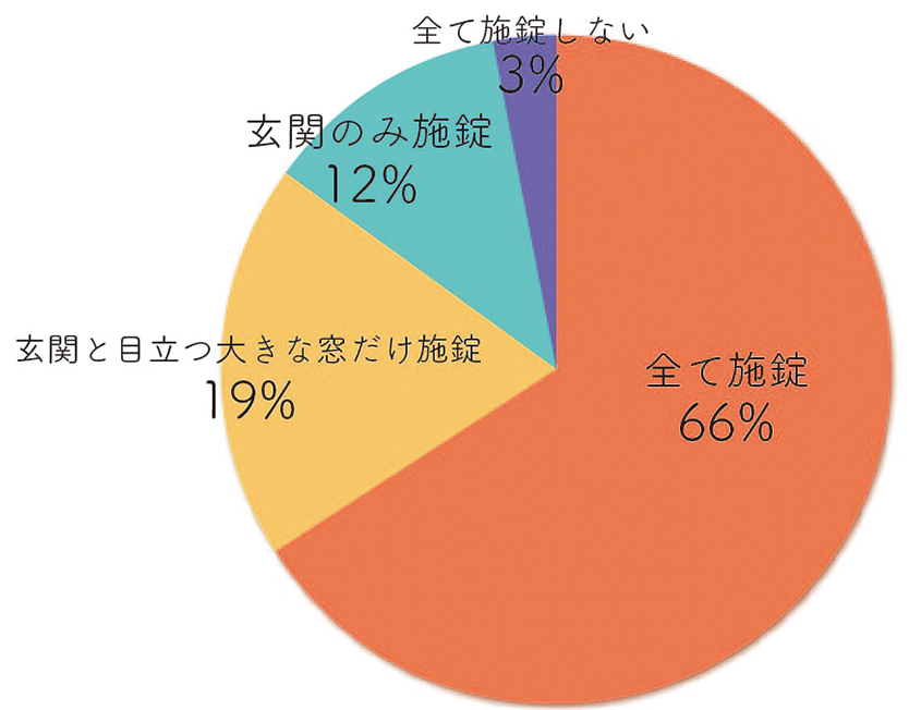「全て施錠」と答えたのは就寢時で約66%、1~2時間の外出で約72%にとどまっており、施錠に関する甘さが浮き彫りになりました。特に就寢時は、玄関は施錠しても、窓が確実に施錠されていないケースが3割ほどみられました。