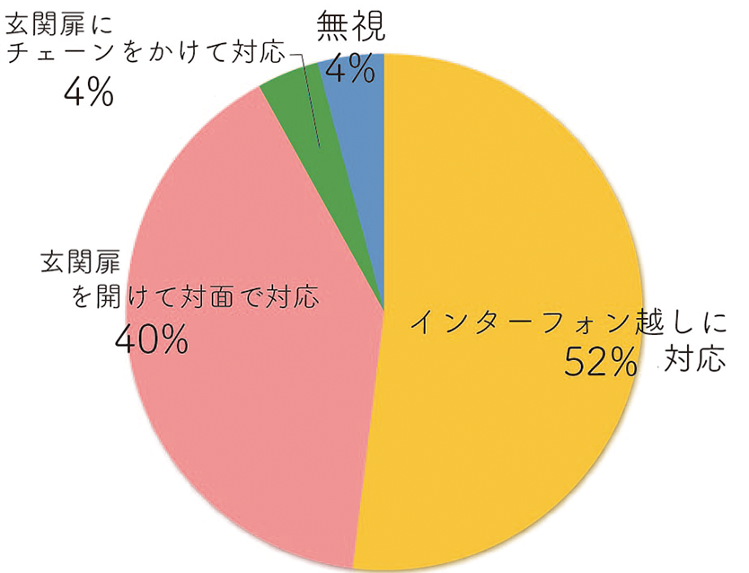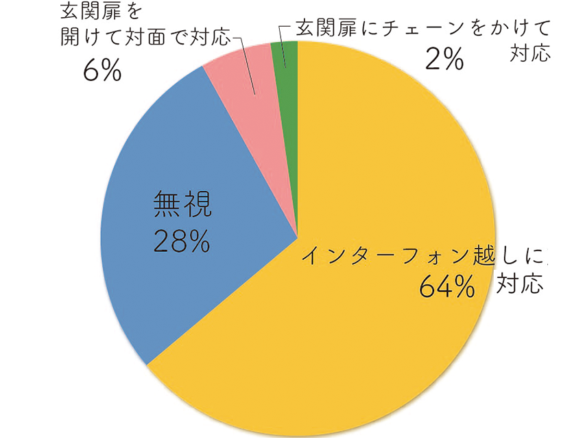 「覚えのない來訪者がインターフォンを鳴らしたら」という問いには、約64%の方が「インターフォン越しに対応」と回答したものの、約28%が「無視」という回答に。