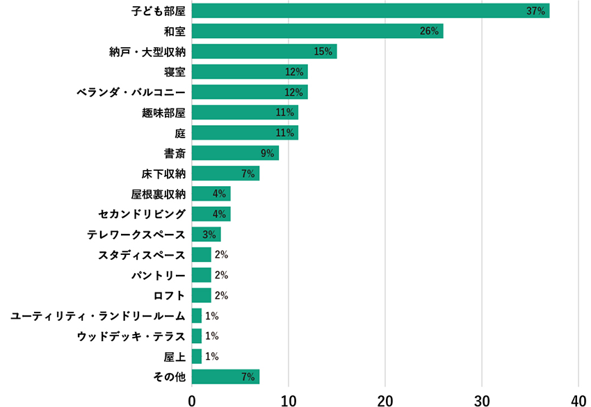 次いで、「納戸?大型収納」(15%)、「寢室」(12%)、「ベランダ?バルコニー」(同)、「趣味部屋」(11%)、「庭」(同)と続きました。