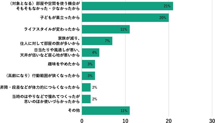 また、子どもの獨立など部屋を利用する人が減った、暑かったり寒かったりなど部屋の環境に問題があって使われなくなったパターンもみられます。以下、回答別に詳細をご紹介します。