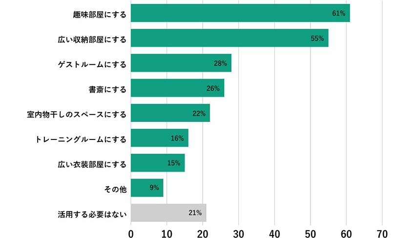 活用法について聞いてみると、「趣味部屋にする」(61%)が最多でした。本棚や座り心地のいい椅子を置いてライブラリースペースにする、趣味のコレクション品を飾る、プロジェクターを設置してシアタールームにするなど、まるで秘密基地のようで夢が広がります。