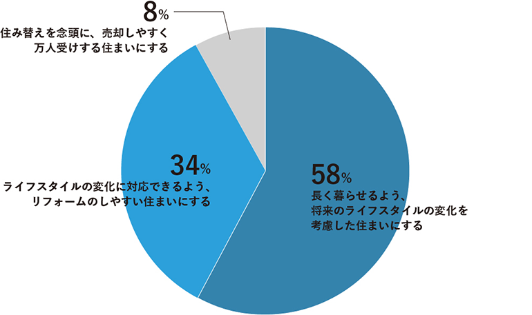 結果は約6割の方が「長く暮らせるよう、將來のライフスタイルの変化を考慮した住まいにする」(58%)と回答。次いで、「ライフスタイルの変化に対応できるよう、リフォームのしやすい住まいにする」(34%)と続きました。