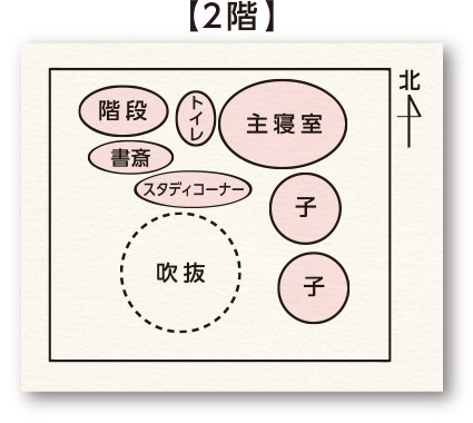 1階のゾーニングが決まったら、次は2階。階段の位置は決まっているので、まずはそこを書(shū)き込みましょう。要望にある吹き抜けは點(diǎn)線で記入しておきます。主寢室は西陽(yáng)の熱を避け、さらに道路から離れた北東の角が良いですね。子ども部屋は朝陽(yáng)で目覚めが良いように東側(cè)に設(shè)けることにします。トイレが必要なら、それも書(shū)き込んでおきましょう。2 階には各部屋が並ぶので、廊下が必要です。もし無(wú)駄に廊下が長(zhǎng)くなるようなら、幅を少し広げて(30~50cm)通行以外の用途(子どもの共有スペースなど)も考えるようにしましょう。廊下の隅にカウンターをつくり付ければ、書(shū)斎コーナーのような空間もできます。このようにして、ざっくりとゾーニングしていくと、ほら目指す家の姿が見(jiàn)えてきましたね。