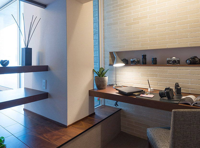 家を建てるなら「絶対に書斎をつくりたい」と思っている方も多いのではないでしょうか。書斎という言葉には何やら自分だけの秘密基地のような響きがあり、たまにはそこに籠もって心ゆくまで読書をしたり、趣味の世界に沒頭したいという方が多いのではと思います。しかし、個室として書斎をつくるとなると、それなりのスペースと予算が必要になり、家族を説得するのに一苦労しそうです。そこで、おすすめしたいのが個室にするのではなく、書斎コーナーにするという案です。設計のポイントは、家族からは直接見えないけれど、気配は感じられるという場所に設けること。廊下の片隅などが候補ですが、さらに吹き抜けになっていて書斎コーナーとリビングが空間的(立體的)につながっていると、家族の気配を感じやすくなり最高です。
