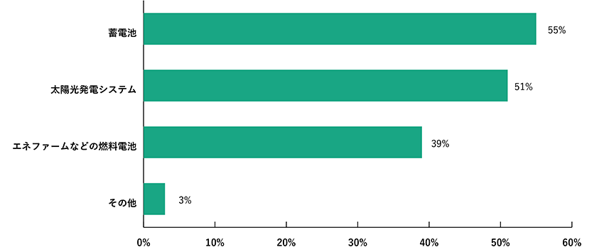 エネルギーを創る「太陽光発電システム」と、創ったエネルギーを蓄える「蓄電池」をセットで選んだ人が目立ちました。また、ガスから取り出した水素と空気中の酸素からエネルギーを創る「エネファームなどの燃料電池」と「蓄電池」を選択した人もいた結果、蓄電池が55%と最も高い數字に。「エネルギーを創る→蓄えて使う」という仕組みが広く浸透していることがうかがえます。