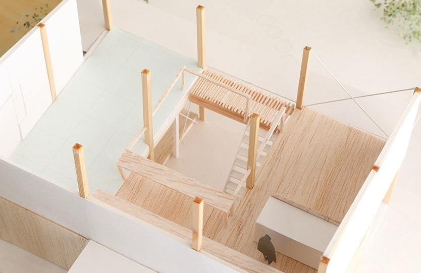 「以前に勤めていた設計事務所で二世帯住宅を設計したことがあります。二世帯住宅において重要なのは、家族それぞれの居場所をどうつくるかではないでしょうか。家族だからこそ共有できる空間があり、一方で個々を尊重する空間も必要です。その住宅ではスキップフロアで家族を分割しながら、それをつなぐ場所として1.5階にダイニング、2階にリビングを配置しました」