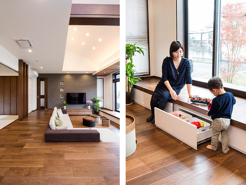 ロースタイルリビングにすると、親子がふれあいやすく、コミュニケーションも深まります。家事や育児に忙しい毎日のなかで、大人が床にしゃがんで子どもと目線を合わせるのは案外面倒なもの。でも、段差があれば気軽に腰掛けられるので、子どもと並んで座り、目線を合わせてお話を聞いてあげたり、絵本を読んであげたりしやすく、子どももうれしそうに肩にもたれかかるなど、親子のスキンシップが自然に生まれます。