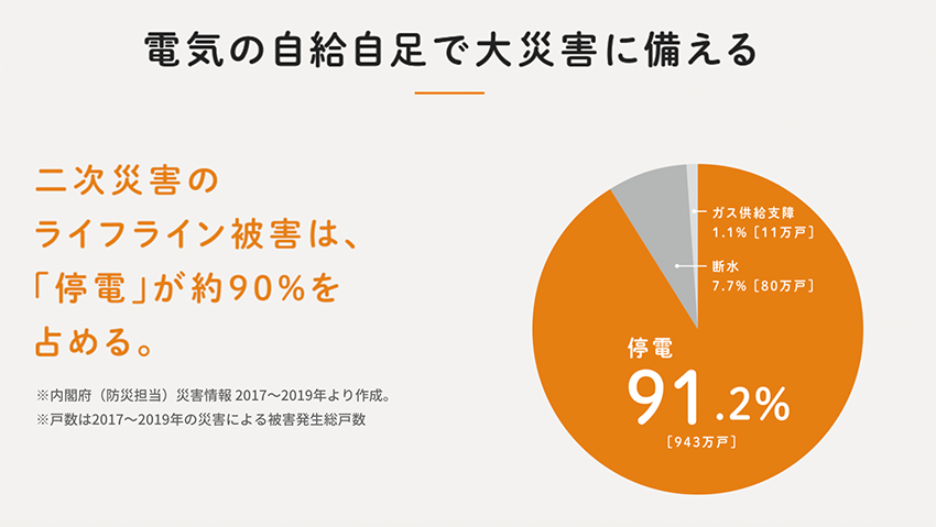 一次災害によって引き起こされる火災や、ライフラインの寸斷などが二次災害です。特に停電によって住宅內で一切電気が使えなくなると、日常の不便はもちろん通信も不通になり、災害時に得たい情報が得られないなど、被災生活にも支障が出ます。