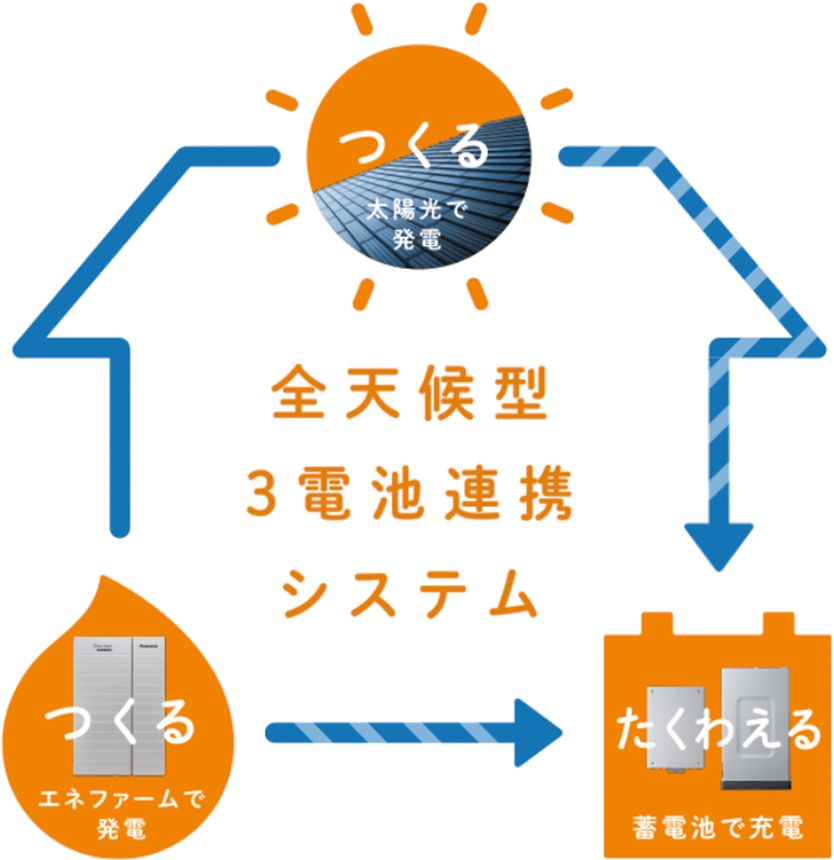 そこでダイワハウスでは「太陽光発電」「燃料電池(エネファーム)」「蓄電池」の3つを組み合わせた業(yè)界初※1の「全天候型3電池連攜システム」を開発しました。燃料電池(エネファーム)は、ガスから取り出した「水素」と、空気中の「酸素」を化學反応させることで電気を創(chuàng)る仕組みで、発電時に発生する熱を給湯にも使えるエコな発電設備です。この3つを連攜させることで、雨天時も約10日分※2の電力?暖房?給湯を確保できます。