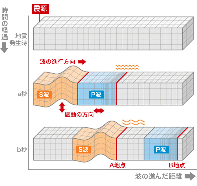 縦波(P波)は橫波(S波)よりも進むスピードが速いため、地震が発生すると最初に縦波(P波)により「ガタガタ」と小刻みに揺れ、その後、橫波(S波)の「ユサユサ」というゆっくりした揺れが來ます。