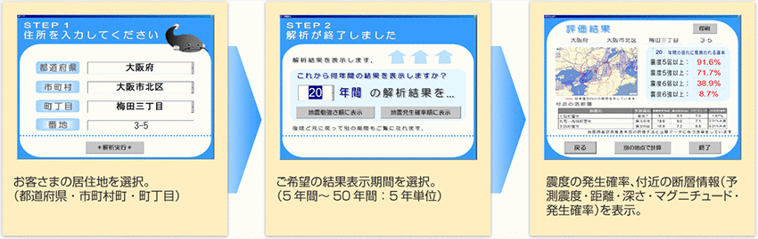 「ココゆれ」は、ITシステムを活用し、任意の地點を入力すると、5年先から50年先まで5年単位の地震の発生確率(5弱以上~6強以上)と付近の斷層情報(予測震度?マグニチュード?発生確率など)を解析し、約30秒で予測できるツールです。近年の余震が繰り返される地震におけるゆれ疲れの警鐘をならし、お客様の防災意識を高めていただくために、2014年よりサービスを開始しました。