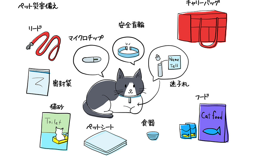 水や食料だけでなく、避難の際に必要なリードやキャリーバッグ、ケージ、排せつ物の処理道具なども準備しておきましょう。また、災害時にペットがけがをしたり、病気にかかったりしても、なかなか治療を受けることはできません。ペットの健康面についても準備が必要です。
