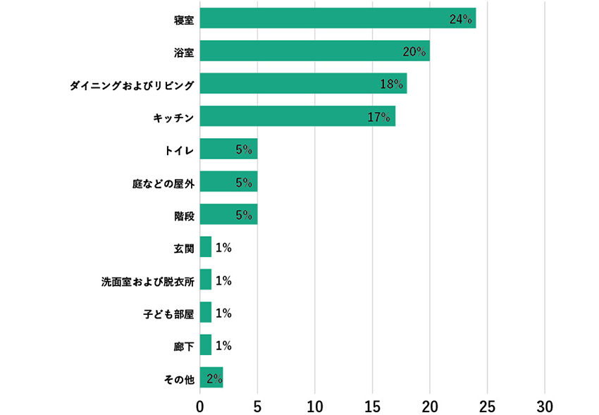 最も多かったのは「寢室」(24%)でした。就寢中はとっさに身を守る行動が取りにくく、夜間の地震被災への不安が大きいことがうかがえます。続いて、無防備な姿のためすぐに避難できない恐れもある「浴室」(20%)、家族が集う場所で大型家具?テレビの転倒やガラス破損のリスクもある「ダイニングおよびリビング」(18%)、火の元や食器棚の転倒など危険要素が多い「キッチン」(17%)が上位に入りました。