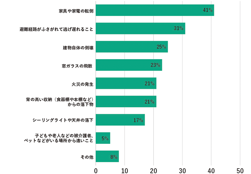 次いで「避難経路がふさがれて逃げ遅れること」(31%)、「建物自體の倒壊」(25%)が上位にあがり、地震による直接的な被害と避難のしやすさへの懸念が大きく影響しているようです。