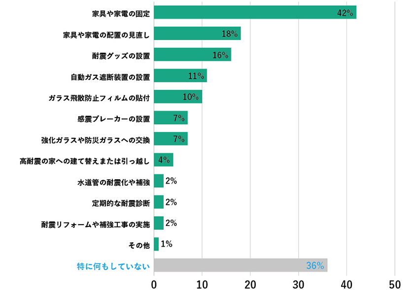 最も多かったのは「家具や家電の固定」(42%)でした。耐震ジェルマットや突っ張り棒など取り入れやすい方法も多く、揺れによる直接的な被害を減らそうとする意識がうかがえます。次に多かったのが「特に何もしていない」(36%)で地震対策に未著手の方も少なくありませんでした。