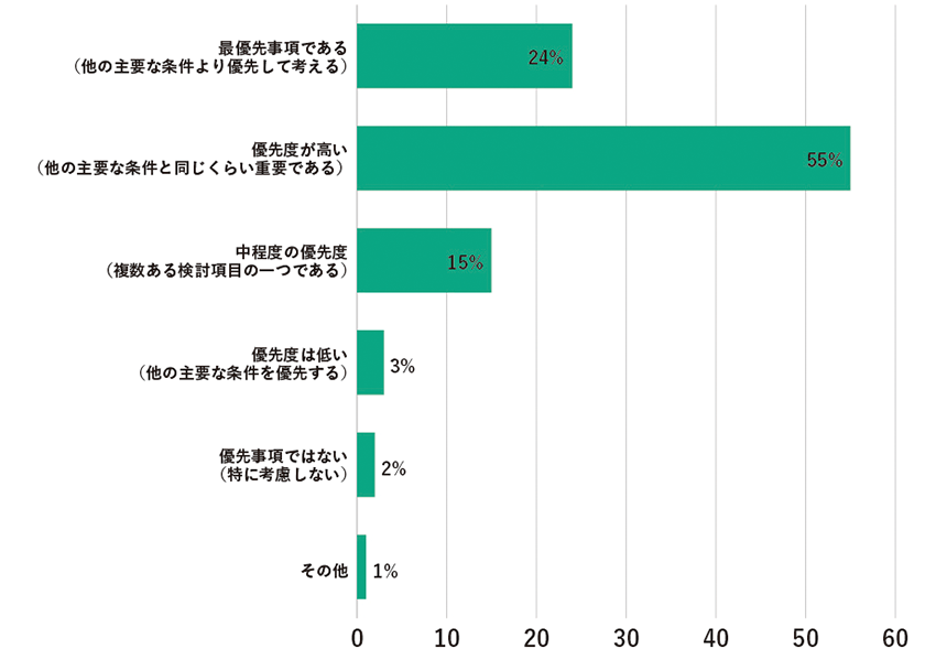 「最優先事項」と答えた24%の方は耐震性能を住まい選びの第一基準としています。「優先度が高い」と答えた55%の方は、価格や立地も考慮しつつ、耐震性能は欠かせない條件と捉えていました。
