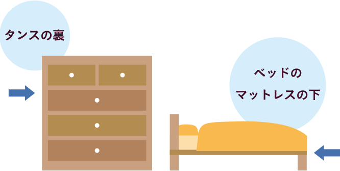 隠し場所として適しているように思えるトイレタンクの中や冷蔵庫の中などは、空き巣にとっては見つけやすい場所です。時間をかけて動かさないと取り出せないタンスの裏や、ベッドのマットレスの下などにしまうのが良いでしょう。空き巣は侵入に5分手間取ると約7割が諦めるといわれています※。さらに取り出すのに5分以上かかるように貴重品をしまえば、諦めて去っていく確率が高まります。