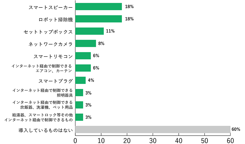 最も多かったのが、音聲のみで音楽を再生したり情報を検索できたりする「スマートスピーカー」と「ロボット掃除機」(いずれも18%)でした。次いで、おうち時間充実のために導入した人も多いと思われる「セットトップボックス(ChromecastやFire TV Stickなどの映像出力機器)」(11%)と続きました。ペットや高齢者の見守り、防犯対策に便利な「ネットワークカメラ」(8%)という回答もありました。