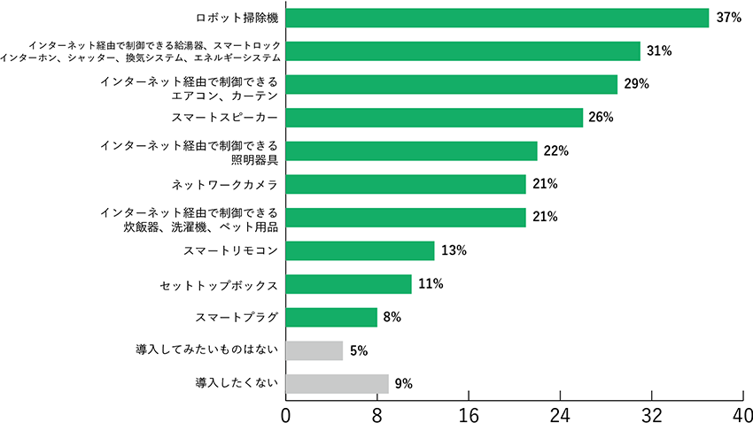 実際の導入狀況と同様に「ロボット掃除機」(37%)が最も多い結果に。次いで、「インターネット経由で制御できる給湯器、ドアロック、インターホン、シャッター、換気システム、エネルギーシステム 」(31%)、「インターネット経由で制御できるエアコン、カーテン」(29%)、「スマートスピーカー」(26%)の順となりました。