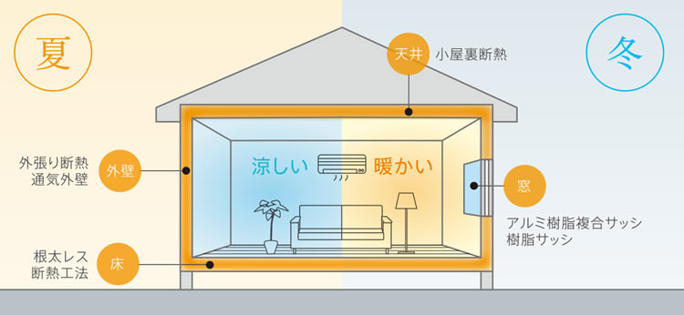 夏は外の暑さを室內に極力取り込まず、エアコンで冷やした空気は外に逃がさない。冬は、外の寒さを極力取り込まず、エアコンや床暖房で暖めた空気を外に逃がさない。これなら、真夏も真冬も快適に過ごせそう!