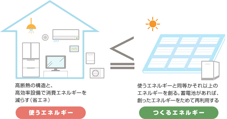 「正味ゼロ」、つまり、空調や給湯、照明などでエネルギーは使うものの、使った分を自分でつくったエネルギーでまかなえる家という意味じゃな。