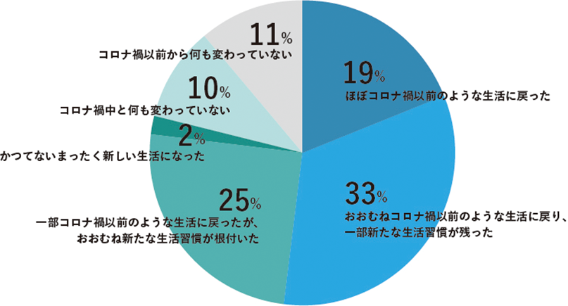 最も多かったのは「おおむねコロナ禍以前のような生活に戻り、一部新たな生活習慣が殘った」(33%)で、「ほぼコロナ禍以前のような生活に戻った」(19%)と合わせると、半數はおおむねコロナ禍以前の生活に戻っているようです。