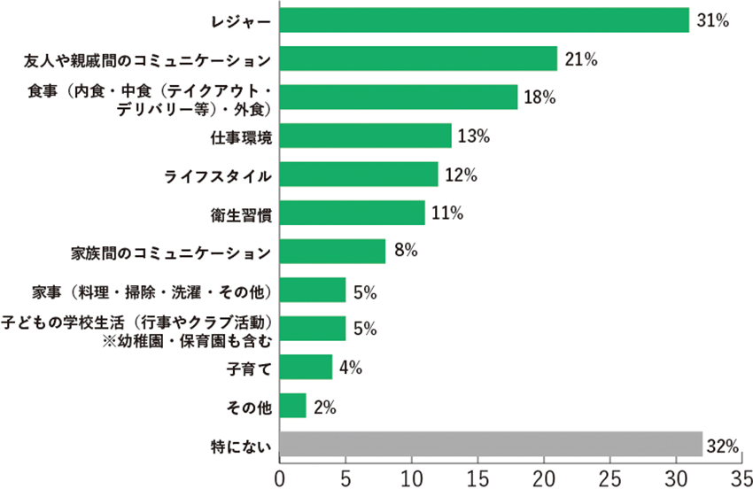 まずは、新型コロナウイルス感染拡大期において、どのような変化があったのかを確認します。「衛生習慣」(46%)が最も多く、「食事(內食、中食(テイクアウト?デリバリー等)、外食)」(43%)、「仕事環境」(41%)、「友人や親戚間のコミュニケーション」(36%)、「レジャー」(35%)と続きました。外出自粛により、さまざまな変化を強いられたことがうかがえます。