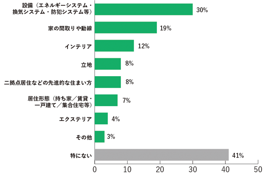 中でも、室內の住環境に関わる「設備」(30%)、「家の間取りや動線」(19%)、「インテリア」(12%)の回答が上位を占めました。具體的にどこをアップデートしたいと思っているのかを見てみましょう。