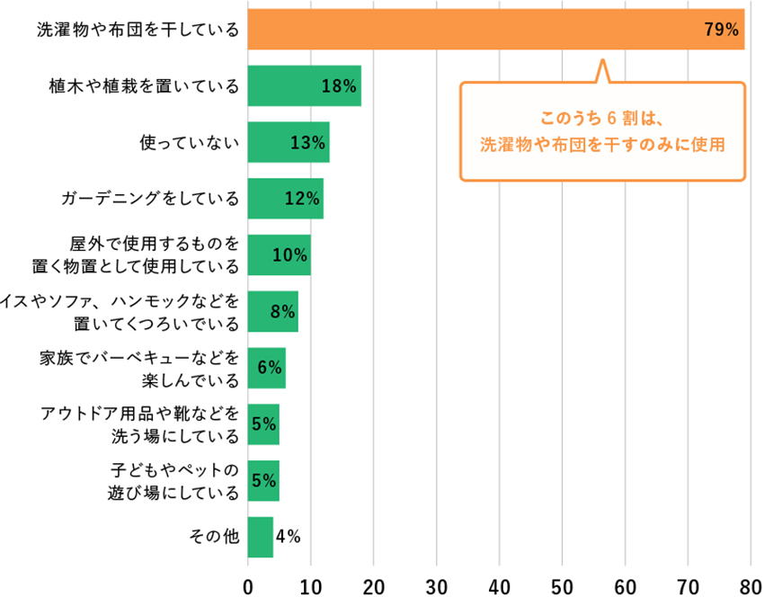 ベランダ?バルコニーの用途を尋ねると、圧倒的に多かったのが「洗濯物や布団を干している」(79%)の回答でした。最近は、乾燥機やランドリールームの導入により、ベランダ?バルコニー不要論も耳にしますが、まだまだベランダ?バルコニーで洗濯物や布団を干している人は多いようです。そして、そのうち6割は、洗濯物や布団を干す用途でしか使っていないことも判明。「ベランダ?バルコニー=洗濯物や布団を干す場所」という認識は根強いようです。