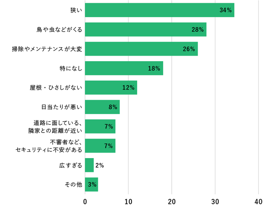 「狹い」(34%)が最多で、次に「鳥や蟲などがくる」(28%)、「掃除やメンテナンスが大変」(26%)、「特になし」(18%)と続きました。この回答は戸建住宅?マンションともに似たような傾向でした。