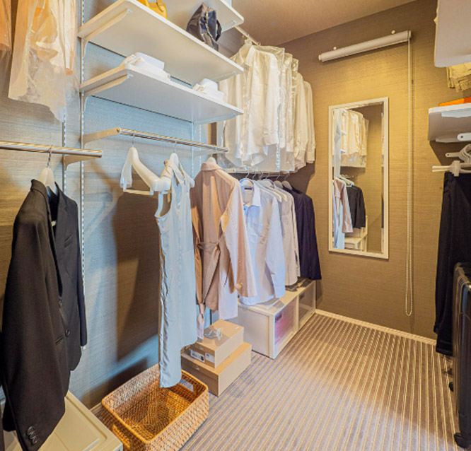 ウォークインクローゼットとは、人が入れるほどの広さを持つ衣類などの収納スペースの総稱。夫婦や家族の衣類をまとめて収納することもできます。出入り口が2つあるものは一般的にウォークスルークローゼットと呼ばれます。