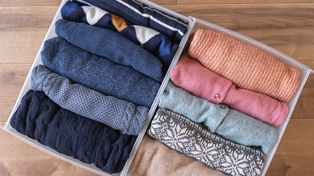ダウンジャケットやセーター、フリースなどは軽量で暖かい冬服の代表例。ただ、収納する際にはかさばってしまうので、適切なたたみ方や圧縮袋で収納時の容量を減らすことも必要です。洗濯表示をもとに洗濯をした後、ダウンは縦半分に折る→橫半分にたたむ→裾の方から筒狀に巻いていく、でコンパクトな収納が可能に。ただしフェザーを使ったダウンジャケットは羽毛の羽が折れることがあるので、専用の圧縮袋を使うことも考慮しましょう。