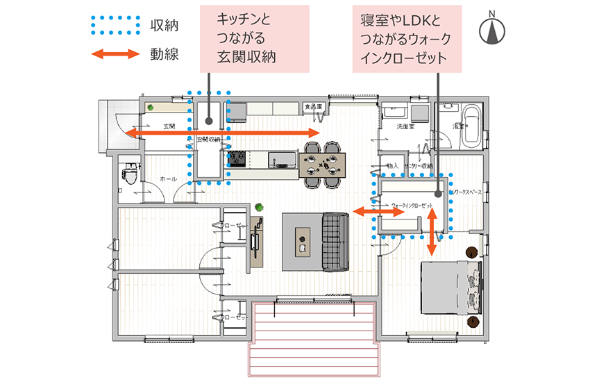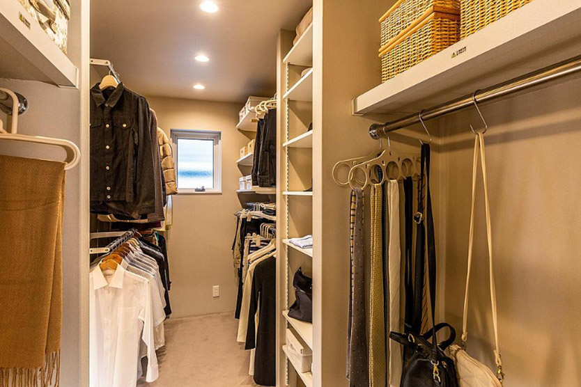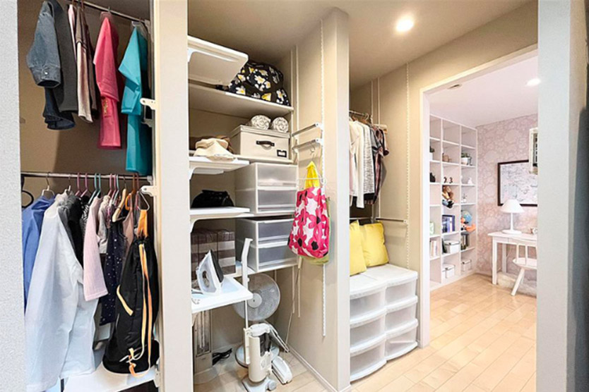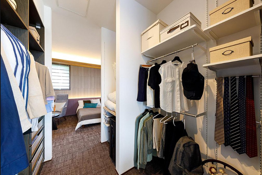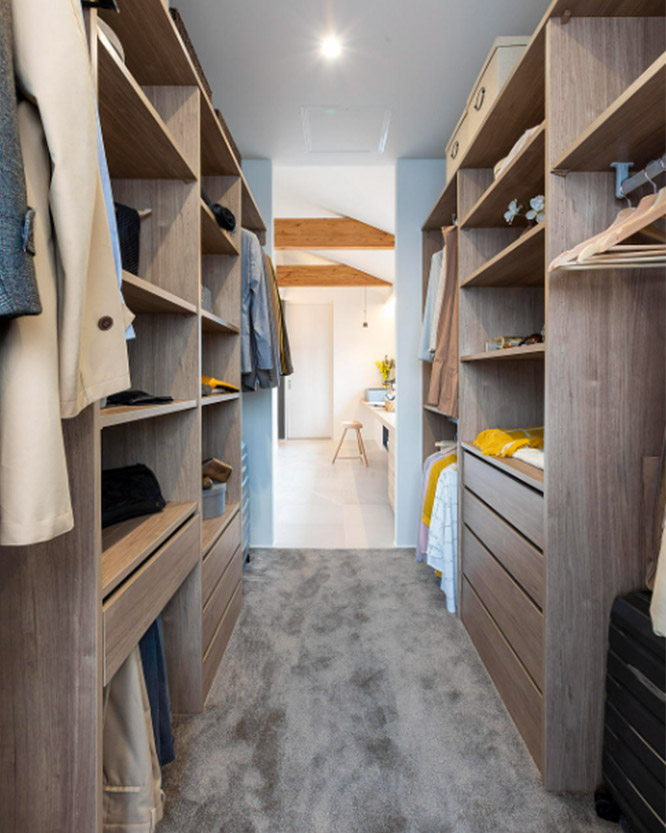 一方で部屋と部屋とをつなぐ通路にもなり、効率的な生活動線をつくりやすくなるのがメリットです。例えば寢室とリビング、玄関とキッチンなどをつなぐと起床後や帰宅後の著替え、備蓄品の収納に便利で、ランドリールームに隣接させると洗濯物を洗う?干す?しまうの移動が少なくできます。