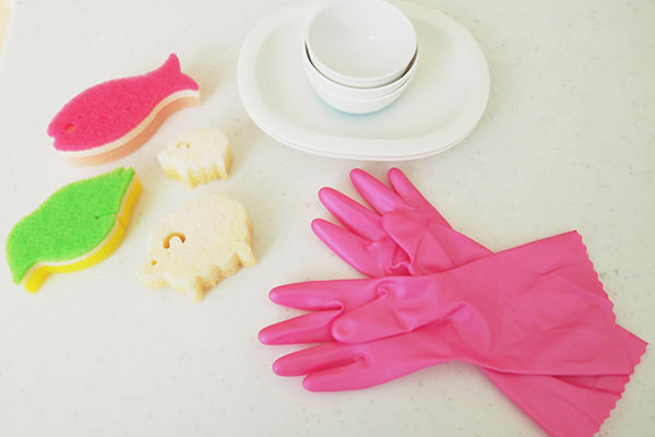 初級は、プラスチック製の食器洗いからスタート。子どもの手の大きさに合ったスポンジや炊事用手袋を用意して。可愛い色や形のアイテムで、楽しくお手伝いしましょう