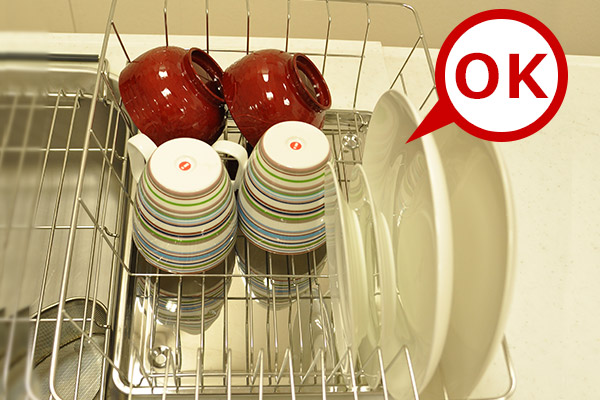 「亀の親子みたいに重ねるのはNG(笑)。重なった部分が乾かないし、山が崩れたら食器が割れる危険もあります」(杉本さん)。「洗うだけでなく、水切れのよい置き方も教えてあげないといけませんね」(多田)