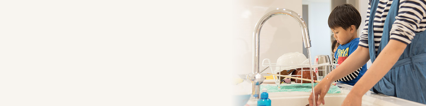 當社の提案する『家事シェアハウス』でも、自分のことは自分でするのが初めの一歩、という考え方があります。子どものおやつのお皿や飲み物のコップを洗うなど小さなことから始めれば、親子共々無理なく進められるかもしれません。