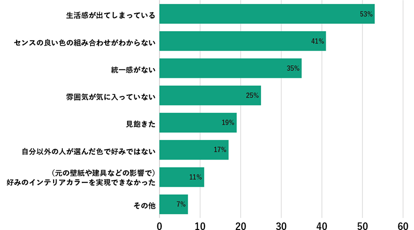 カラーコーディネートに満足していない理由として上位にあがったのは、「生活感が出てしまっている」(53%)、「センスの良い色の組み合わせがわからない」(41%)、「統一感がない」(35%)などでした。