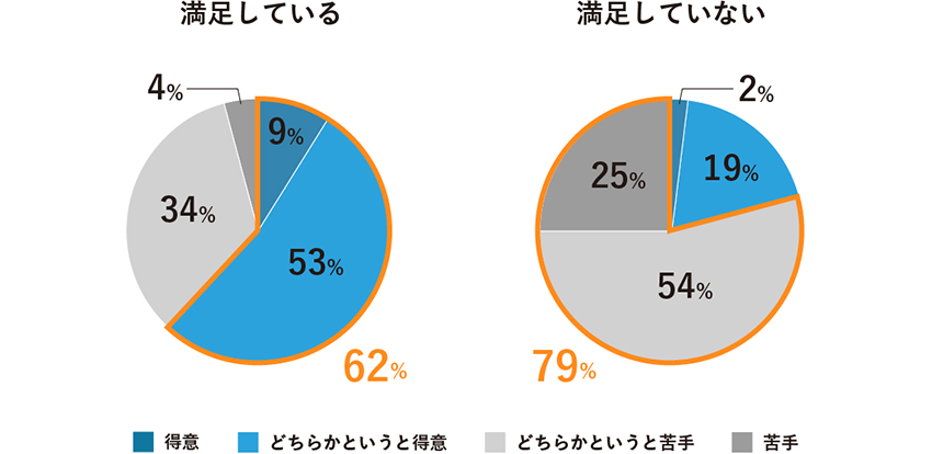 一方、「満足していない」と回答している方を見ると「どちらかというと苦手」(54%)、「苦手」(25%)を合わせた約8割に及ぶ方がカラーコーディネートに苦手意識を持っていました。