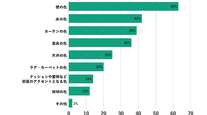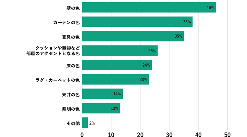 半數近くの回答が集まったのは「壁の色」(46%)でした。最近は白系に限らず、さまざまな色の壁紙で部屋の雰囲気を演出する方が増えています。しかし、カーテンのように気軽には変えられないため悩むのも納得です。次に多かったのが「カーテンの色」(38%)、「家具の色」(35%)と続きました。