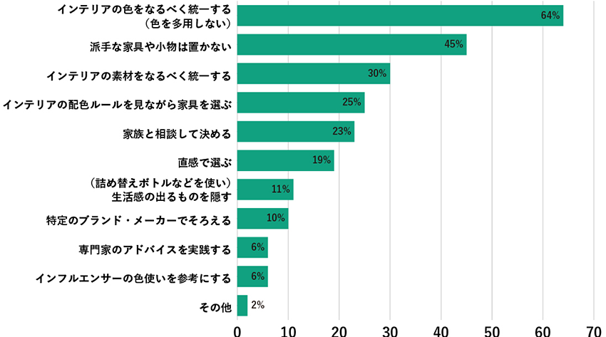 最も多かったのは「インテリアの色をなるべく統一する(色を多用しない)」(64%)でした。空間の中に何色もの色が混在すると、ごちゃごちゃとした印象になりやすいものです。次に多かった「派手な家具や小物は置かない」(45%)も、色の統一という點で納得の回答です。「インテリアの素材をなるべく統一する」(30%)も上位にランクイン。色がバラバラでも、素材をそろえれば統一感が生まれます。「統一感」はカラーコーディネートにおいて大切なキーワードのようです。
