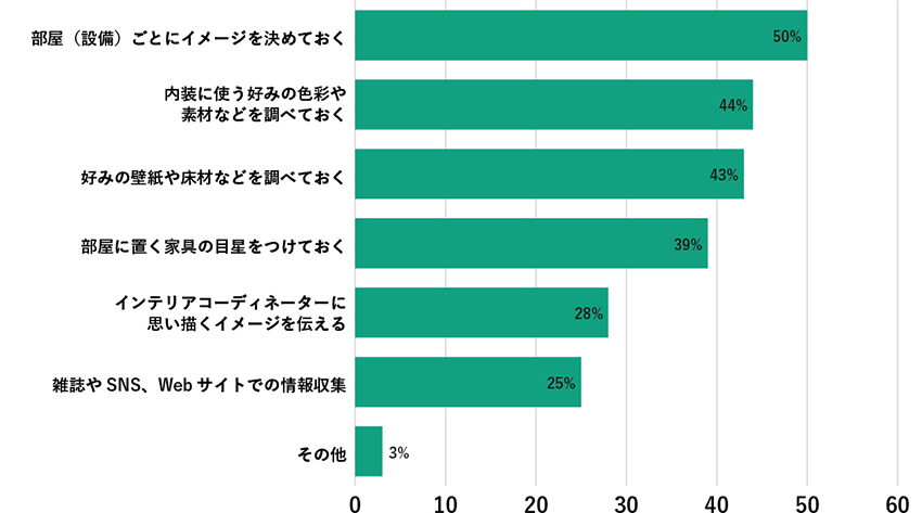 結果、半數の方が「部屋(設備)ごとにイメージを決めておく」(50%)と回答しました。次に多かったのが「內裝に使う好みの色彩や素材などを調べておく」(44%)、「好みの壁紙や床材などを調べておく」(43%)でした。現狀の反省や経験を踏まえてか、設計の検討段階では、壁紙や床材、家具といった詳細な部分よりも、部屋全體のイメージを明確にしておくことを重要視する方が多い印象でした。