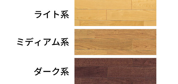 全體のイメージを確認後、部屋の印象を大きく左右する床を見ます。床材は、ライト系、ミディアム系、ダーク系の3色が基本カラーとなります。床の基本カラーが決まったら、それにあわせて建具を検討していきましょう。