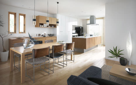 オープンキッチンの場合、忘れがちなのがリビング?ダイニングとキッチンのつながり。収納キャビネットやキッチン扉の色を選ぶときは、リビングやダイニングの家具の色などとのバランスも考えましょう。