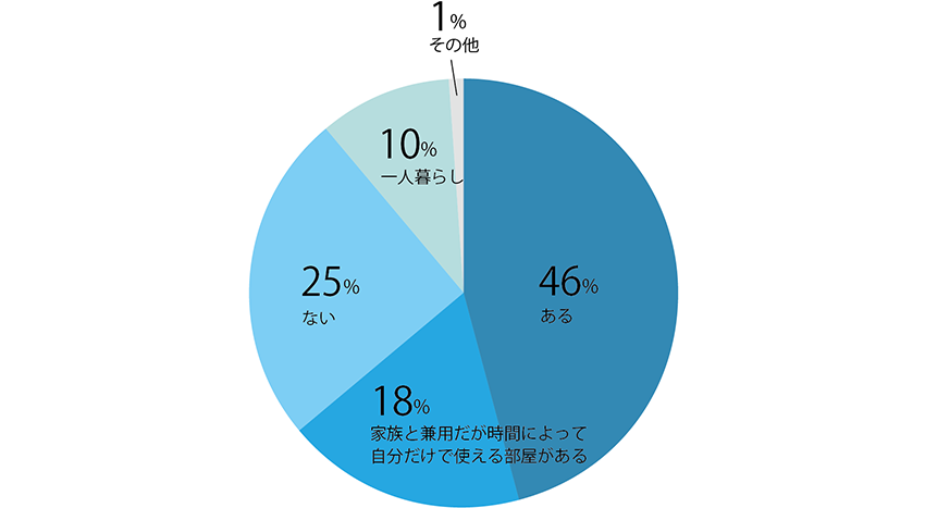 もっとも多かったのは「ある」(46%)。次點は「家族と兼用だが時間によって自分だけで使える部屋がある」(18%)となり、合わせると64%の方が個室として使える空間を持っていることが分かりました。例えば子どもが學校に行っている間に、子ども部屋の機をテレワークで使うといったケースなど、限られたスペースを時間の區切りによって上手に活用しているご家庭も多いことでしょう。
