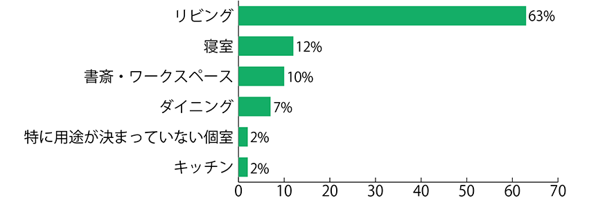 長く過ごす場所としては「リビング」(63%)が圧倒的に多く、「寢室」(12%)、「書斎?ワークスペース」(10%)、「ダイニング」(7%)と続きました。前問では個室所有率が6割を超えていましたが、長く過ごすのはリビングという結果に。