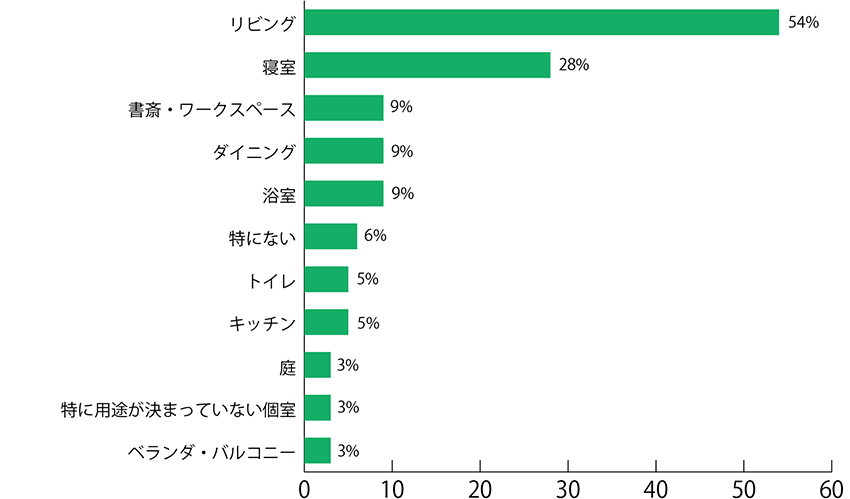 前問と同様に多かったのは「リビング」(54%)、「寢室」(28%)という結果に。「もっとも長く過ごす場所」と「居心地のいい場所」はおおむね一致しているようです。