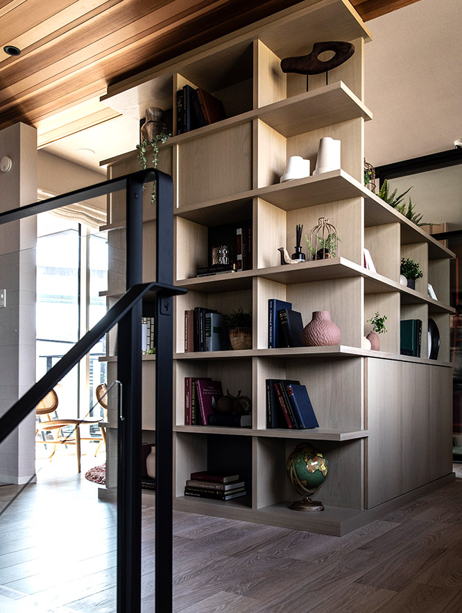 例えば、空間を仕切る壁の代わりに造作棚をつくるのも一つの方法です。両側から使えるように工夫された棚は、ただ収納するだけでなく、ディスプレイを楽しむ魅せる収納にもおすすめ。壁そのものが収納棚になっていることでスペースを有効活用でき、圧迫感も抑えることができます。